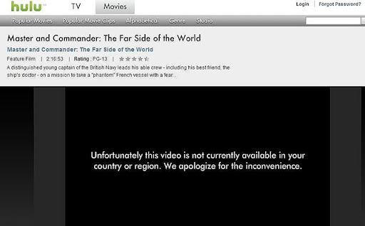 I decided to celebrate by exploring Hulu, a new service that streams American television and movies over the Internet for free. I registered, and found an interesting selection of films and classic shows. But, any attempt to watch anything brought the message: